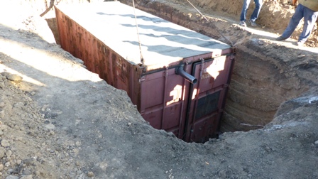 Один из первых оборудованных контейнеров привезли на блок-пост на выезде из Мариуполя. В присутствии городского головы Юрия Хотлубея, являющегося председателем Штаба территориальной обороны Мариуполя, контейнер опустили в заранее выкопанную траншею.