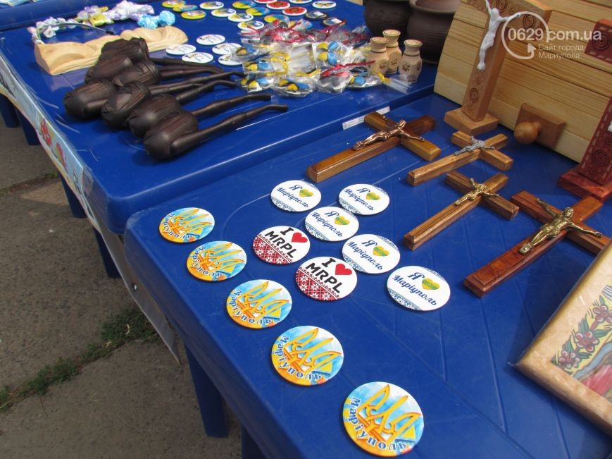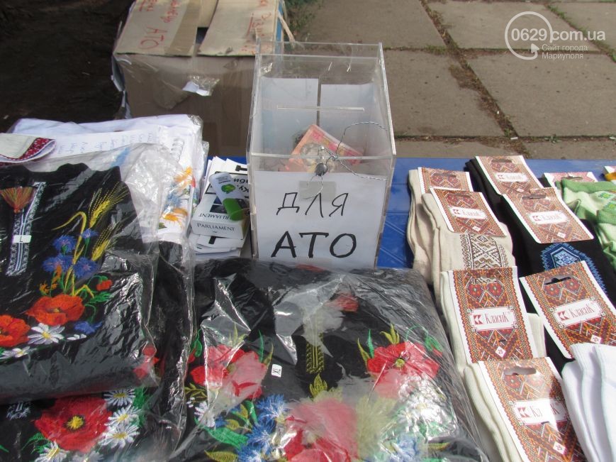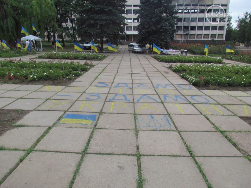 Группа мариупольцев, протестующих против демилитаризации Широкино, украсила площадь перед сгоревшим горсоветом надписью «Сдадим Мариуполь – сдадим Украину!», а также организовала благотворительную ярмарку, - сообщает местный сайт «0629».