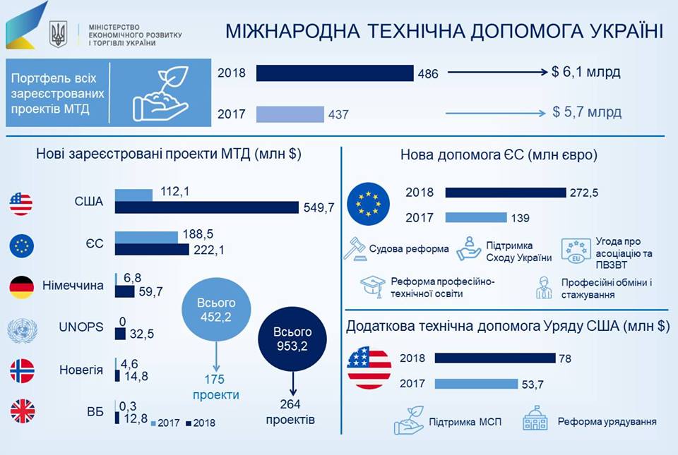 Сумма привлеченной в Украину международной технической помощи в 2018 году составила 953,2 млн долларов. Об этом сообщает пресс-служба Министерства экономического развития и торговли Украины.