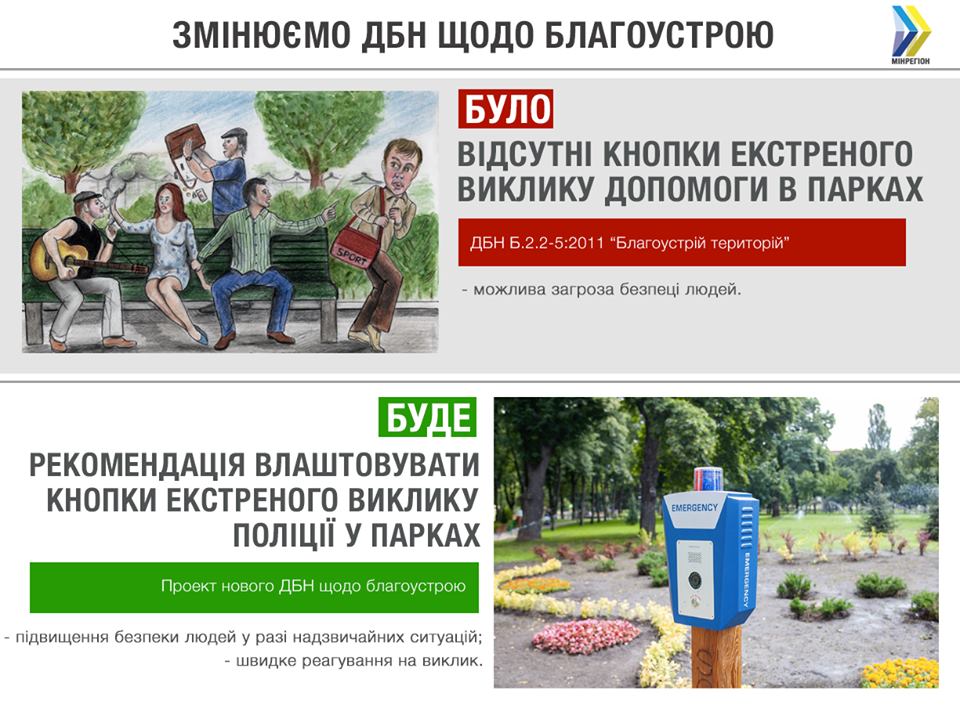 "Тем более, что в некоторых новых парках это уже начинают делать. Поэтому почему бы не нормировать этот вопрос и в ГСН (Государственные строительные нормы). Идею установки кнопок вызова экстренной помощи в парках поддержали и здесь, в Facebook. Практически все из более чем 5000 пользователей, которые отреагировали на опрос, "ЗА" установку кнопок вызова экстренной помощи в парках. Также многие предложили по возможности обустроить такие боксы с кнопками системами видеонаблюдения или другой защиты от ложных вызовов полиции", - отметил он.
