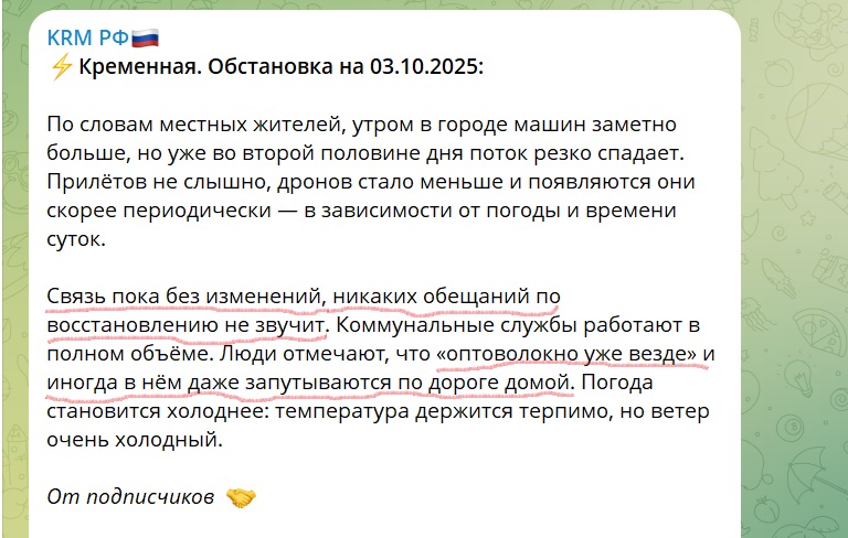 <p style="text-align: justify;">«Люди отмечают, что (в Кременной. - „ОстроВ“) "оптоволокно уже везде" и иногда в нем даже запутываются по дороге домой», - со ссылкой на своих подписчиков пишет оккупационный паблик 3 октября.</p> <p style="text-align: justify;">А восстановление мобильной связи оккупанты даже не обещают. «Связь пока без изменений, никаких обещаний по восстановлению не слышно», - говорится в сообщении. </p> <div class="article__content__img"><img class="" title="" src="/upload/media/2025/10/03/111.jpg" alt="" /></div> <p style="text-align: justify;">По информации «ОстроВа», мобильная связь в Кременной и соседних селах отсутствует несколько месяцев. </p> <p style="text-align: justify;">«...Люди сильно устали за это время. Особого внимания требует восстановление мобильной сети», - сообщал оккупационный паблик 30 сентября.</p> <p style="text-align: justify;">Также сообщается, что в Кременной сейчас есть перебои со светом.</p> <p style="text-align: justify;">Ранее сообщалось, что <a href="/news/u-kreminnij-gamirno-zvedennya-boyiv-u-luganskij-oblasti-i534452" target="_blank" rel="noopener">«в Кременной несколько дней шумно. Были прилеты по окрестностям и даже в центр прилетало, и не только дронами».</a></p>