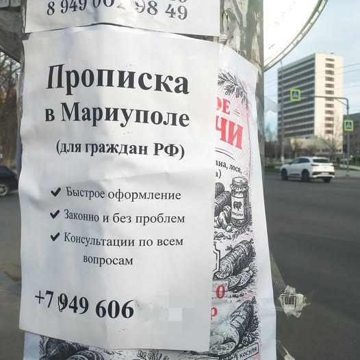 Объявления о том, что «граждане РФ» могут легко и быстро получить прописку в захваченном россиянами украинском городе, появились на улицах Мариуполя