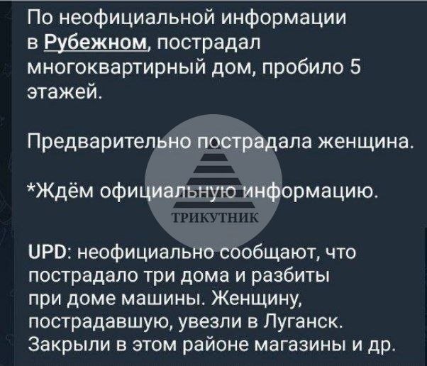 О «падении авиационной бомбы» на пятиэтажный дом в оккупированном Рубежном на Луганщине 23 апреля сообщили несколько местных пабликов.