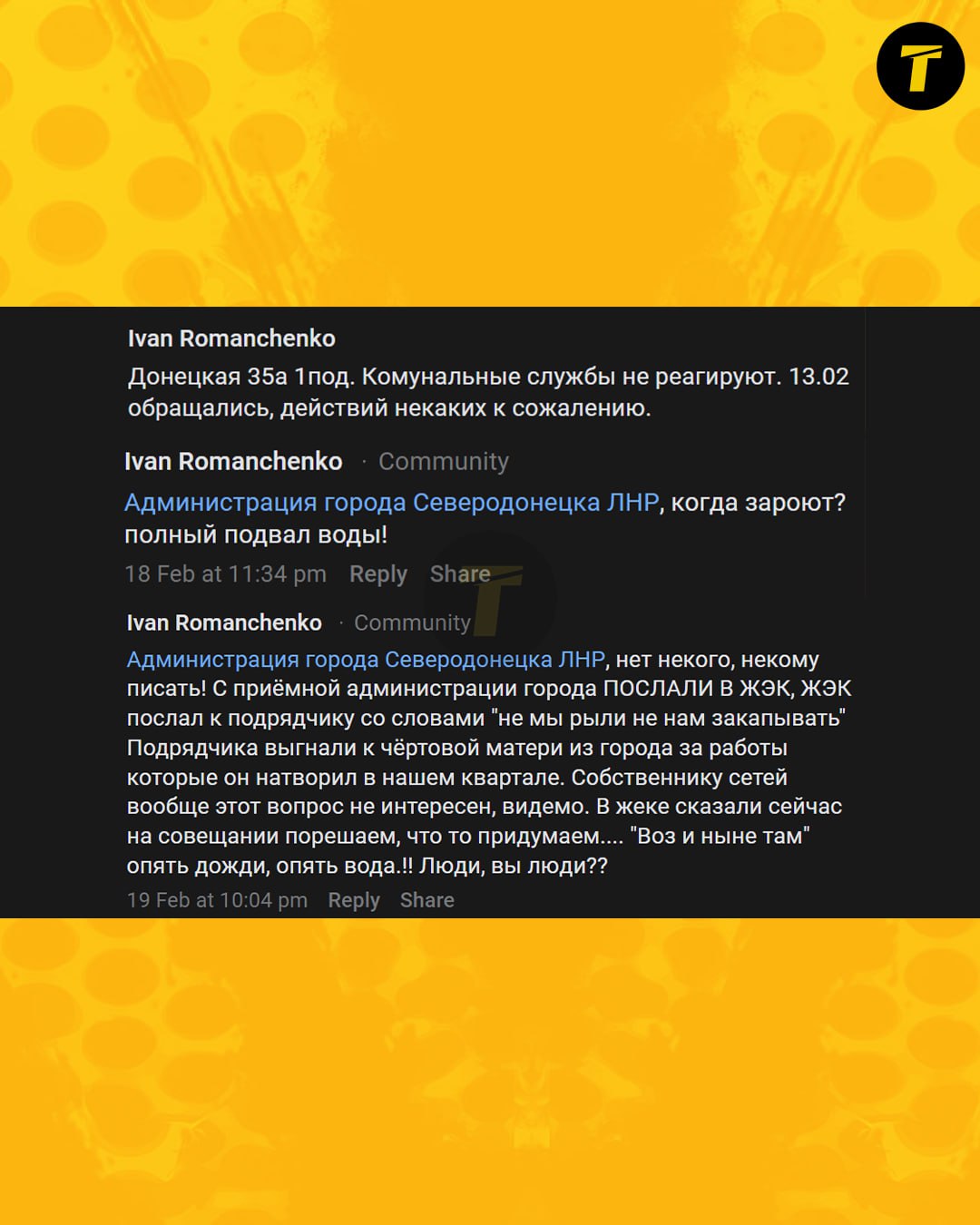 "Житель оккупированного Северскодонецка показал, как из-за разрытых траншей вода попадает в подвалы. На видео - дом по ул. Донецкой, 35А, 1-й подъезд. Видно, как дождевая вода стекает траншеями и попадает в подвалы", - сообщил Телеграм-канал "Трибун. Схід", разместив соответствующее видео 21 февраля.
