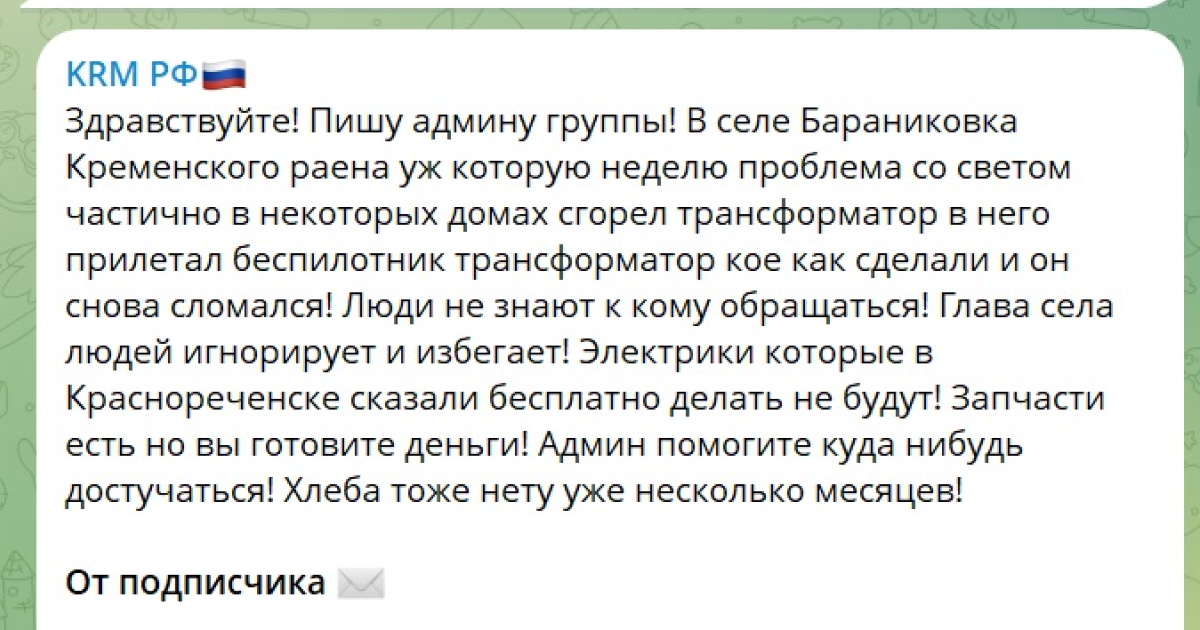 <p style="text-align: justify;">"В селе Бараниковка Кременского района уже которую неделю проблема со светом. ...Сгорел трансформатор, в него прилетал беспилотник, трансформатор кое-как сделали и он снова сломался! Люди не знают к кому обращаться! Глава села людей игнорирует и избегает! Электрики, которые в Краснореченске, сказали - бесплатно делать не будут! Запчасти есть, но вы готовите деньги!", - написал подписчик оккупационного паблика 8 октября. </p> <p style="text-align: justify;">Он также сообщил, что в селе уже несколько месяцев нет хлеба.</p> <p style="text-align: justify;">Ранее сообщалось, что <a href="/news/v-okupovanij-kreminnij-lyudy-vzhe-zaplutuyutsya-v-optovolokni-i534926" target="_blank" rel="noopener">в оккупированной Кременной люди уже запутываются в оптоволокне.</a></p>