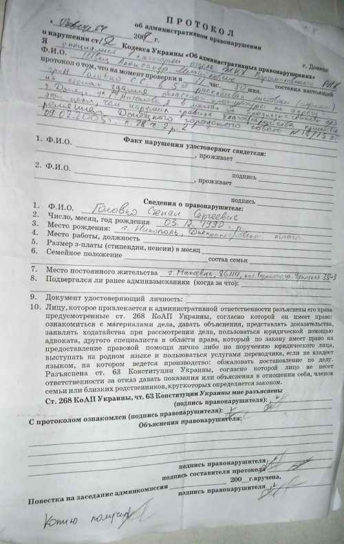 Протокол об административном правонарушении, составленный в отношении Степана Головко.