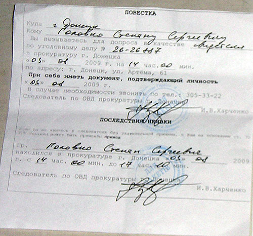 Повестка, выписанная С. Головко в прокуратуре г. Донецка.