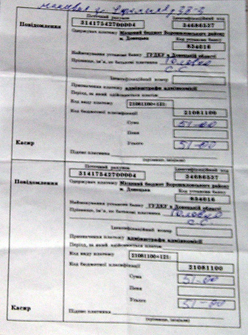 Квитанция для уплаты штрафа в размере 51- грн. на имя С. Головко