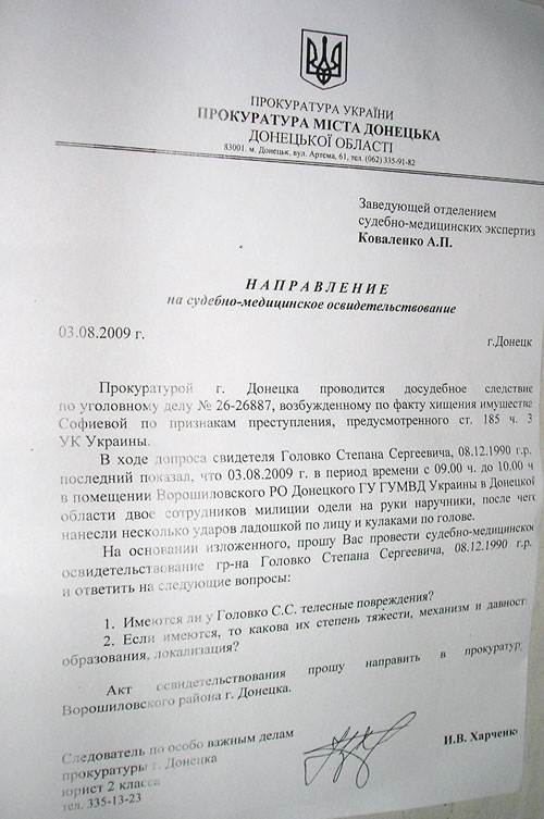 С. Головко написал заявление в прокуратуру г. Донецка о факте избиения работниками Ворошиловского райотдела милиции. Следователь прокуратуры И. Харченко выдал С. Головко направление на судебно-медицинское освидетельствование.