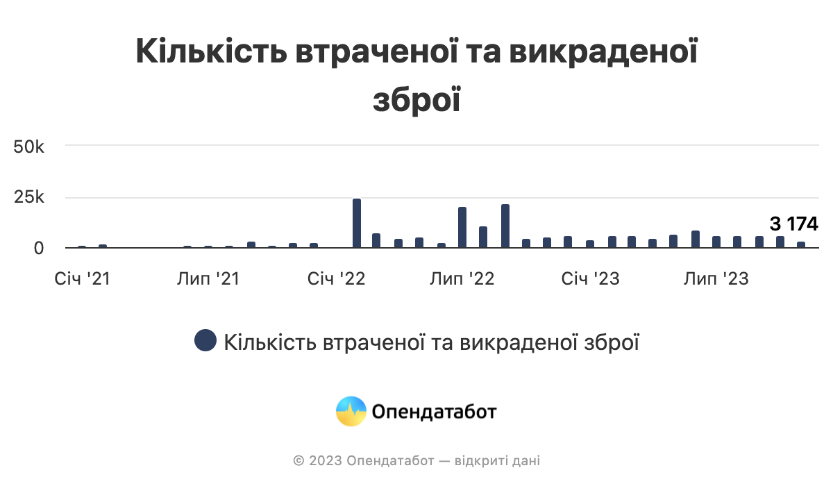С февраля 2022 года подавляющее большинство — 80% оружия было потеряно, и только 20% — украдено. Наибольшее количество похищенного оружия приходится на 2022 год: более 26 тысяч. Уже с начала 2023 года количество похищенного оружия резко уменьшилось и составляет 2 тысячи единиц.