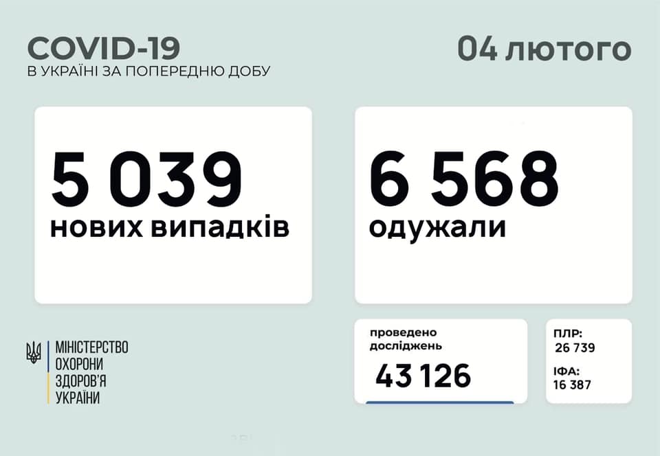 В Украине за прошлые сутки зафиксировано 5039 новых случаев коронавирусной болезни COVID-19. Об этом сообщает министр здравоохранения Максим Степанов в Facebook.