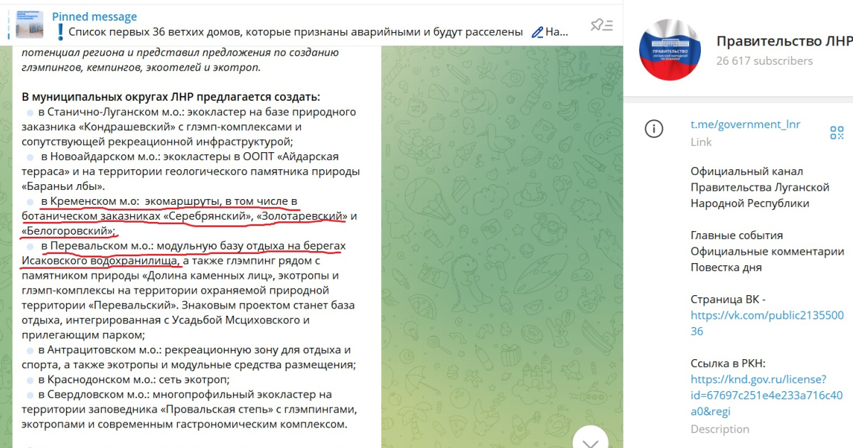 <p style="text-align: justify;">"В ЛНР планируется построить глэмпинги, экоотели, кемпинги и создать экотропы... Реализация проектных предложений создаст новые точки притяжения для внешнего и внутреннего туризма, значительно снизит эффект сезонности, расширит и диверсифицирует туристское предложение", - сообщило так называемое "правительство ЛНР" в Телеграм 13 октября.</p> <p style="text-align: justify;">При этом оккупанты практически уничтожили экологию области, восстанавливать что-либо в таких реалиях абсолютно нереально.</p> <p style="text-align: justify;">Полный список обещанного оккупационным "правительством" - на скриншоте. Особенно впечатляет, что в Кременском "муниципальном округе" собираются создать "экомаршруты, в том числе в ботаническом заказниках "Серебрянский", "Золотаревский" и "Белогоровский". Кременная находится в непосредственной близости от линии фронта, в Кременском лесу идут активные боевые действия, а в городе, как писал "ОстроВ", <a href="/news/v-okupovanij-kreminnij-lyudy-vzhe-zaplutuyutsya-v-optovolokni-i534926?changeLang=ua" target="_blank" rel="noopener">люди запутываются в оптоволокне</a>.</p> <p style="text-align: justify;">Стоит отметить и планы построить в Перевальском "муниципальном округе" "модульную базу отдыха на берегах Исаковского водохранилища". Как сообщал "ОстроВ" со ссылкой на самих же оккупантов, <a href="/news/na-okupovanij-z-2014-roku-terytoriyi-luganshhyny-strimko-miliye-isakivske-vodoshovyshhe-i527073" target="_blank" rel="noopener">Исаковское водохранилище стремительно мелеет, угрожая водоснабжению региона.</a></p> <p style="text-align: justify;">"ОстроВ" системно это отслеживает, ознакомиться в деталях со всем тем, что происхоит с экологией, можно по тегу<a href="/tag/ekologiya-v-okupatsiyi" target="_blank" rel="noopener"> Екологія в окупації</a>.</p>