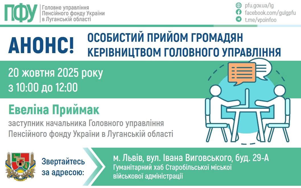 <p style="text-align: justify;">«В понедельник, 20 октября, в хабе Старобельской общины во Львове будет консультировать заместитель начальника Главного управления Пенсионного фонда Украины в Луганской области Эвелина Приймак», - сообщила Луганская ОВА в соцсетях 17 октября.</p> <p style="text-align: justify;">Обращаться можно с 10:00 до 12:00 по адресу: г. Львов, ул. Ивана Выговского, д. 29-А.</p> <p style="text-align: justify;">Ранее сообщалось, что <a href="/news/pereselentsyam-z-luganshhyny-v-harkovi-dopomozhut-vyrishyty-pytannya-pensijnogo-zabezpechennya-i536136" target="_blank" rel="noopener">переселенцам из Луганской области в Харькове помогут решить вопросы пенсионного обеспечения.</a></p> <div class="article__content__img"><img class="" title="" src="/upload/media/2025/10/17/photo-2025-10-17-10-29-06.jpg" alt="" /></div>