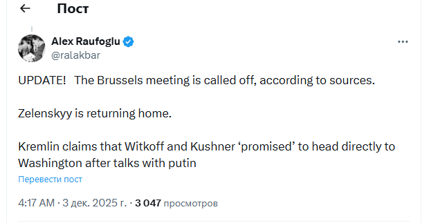 "Согласно источникам, встреча в Брюсселе отменена. Зеленский возвращается домой. Кремль утверждает, что Виткофф и Кушнер "пообещали" после переговоров с Путиным сразу отправиться в Вашингтон", - написал в Х журналист Kyiv Post Алекс Рауфоглу.