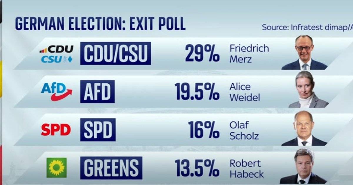 Результаты экзит-полов на досрочных парламентских выборах в Германии свидетельствуют о победе правоцентристских христианских демократов (ХДС/ХСС), которые набрали 29%. Об этом сообщает Sky News.