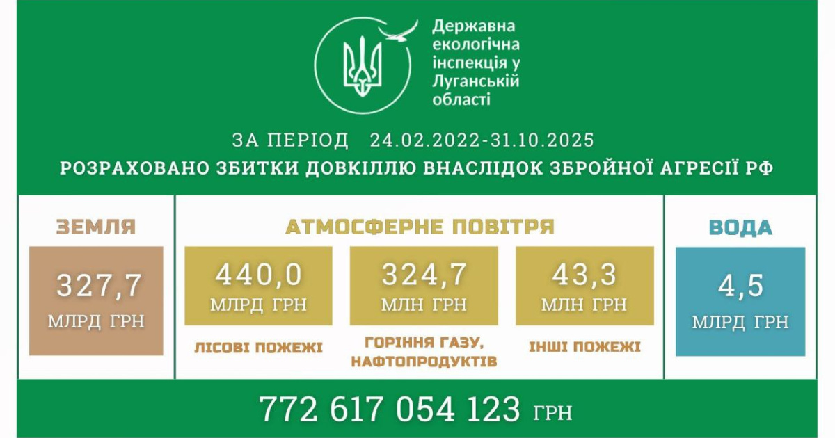 <p style="text-align: justify;">"Ежедневные боевые действия на территории области приводят к масштабному разрушению природной среды. За последний месяц ущерб окружающей среде региона, рассчитанный специалистами Государственной экологической инспекции в Луганской области, вырос с 764,28 млрд грн до 772,62 млрд грн", - сообщила Луганская ОГА в соцсетях 31 октября.</p> <p style="text-align: justify;">Рост этого показателя на 8,34 миллиарда грн обусловлен масштабными лесными пожарами, возникшими на оккупированной территории области.</p> <p style="text-align: justify;">Таким образом, по состоянию на 31 октября 2025 года, в области зафиксировано и рассчитано ущерб окружающей среде на общую сумму 772 млрд 617 млн 054 тыс. 123 грн.</p> <p style="text-align: justify;"> В частности, из-за:</p> <p style="text-align: justify;">- засорения земель – 327 млрд 680 млн 834 тыс. 937 грн;</p> <p style="text-align: justify;">- лесные пожары – 440 млрд 038 млн 791 тыс. 701 грн;</p> <p style="text-align: justify;">- горение газа – 324 млн 711 тыс. 905 грн;</p> <p style="text-align: justify;">- другие пожары – 43 млн 345 тыс. 033 грн.</p> <p style="text-align: justify;">Ранее сообщалось, что <a href="/news/u-znyshhenij-ekosystemi-luganshhyny-okupanty-obitsyayut-stvoryty-glempingy-kempingy-ta-ekostezhky-i535990" target="_blank" rel="noopener">в уничтоженной экосистеме Луганщины оккупанты обещают создать «глэмпинги, кемпинги и экотропы».</a></p>