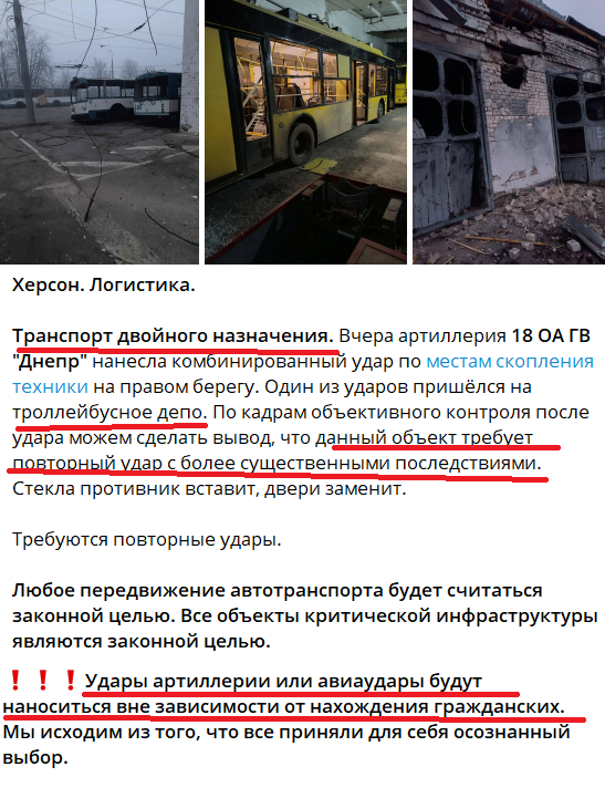 Популярный российский Телеграм-канал (53 000 подписчиков, официально зарегистрирован в Роскомнадзоре) назвал пассажирский транспорт Херсона "транспортом двойного назначения" и призвал наносить по нему артиллеристские и ракетные удары