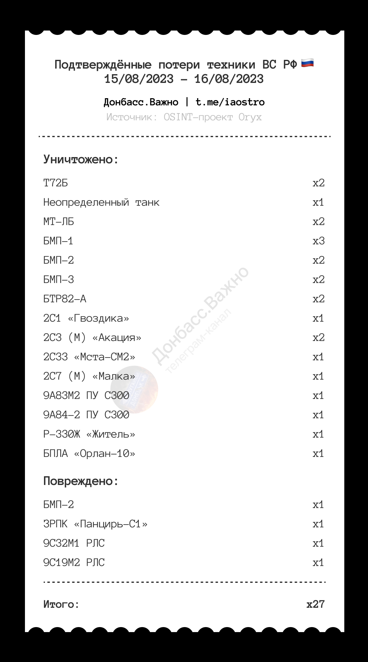 Подразделения ВСУ 15-16 августа уничтожили 27 единиц российской техники. Такими данными оперирует мониторинговая миссия ORYX, сообщает Телеграм-канал "Донбасс.Важно".