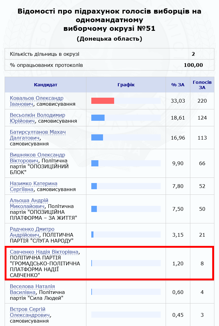 Восемь человек проголосовало за кандидата в нардепы и Героя Украины Надежду Савченко на Донетчине. Об этом свидетельствуют данные ЦИК, который обработал 100% протоколов по округу №51 с центром в прифронтовом Зайцево Донецкой области.