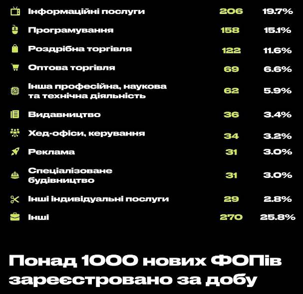 Он отметил, что по данным OpenDataBot, в топе по популярности – ФЛП, предоставляющие информационные услуги, ИТ-сфера и розничная торговля.