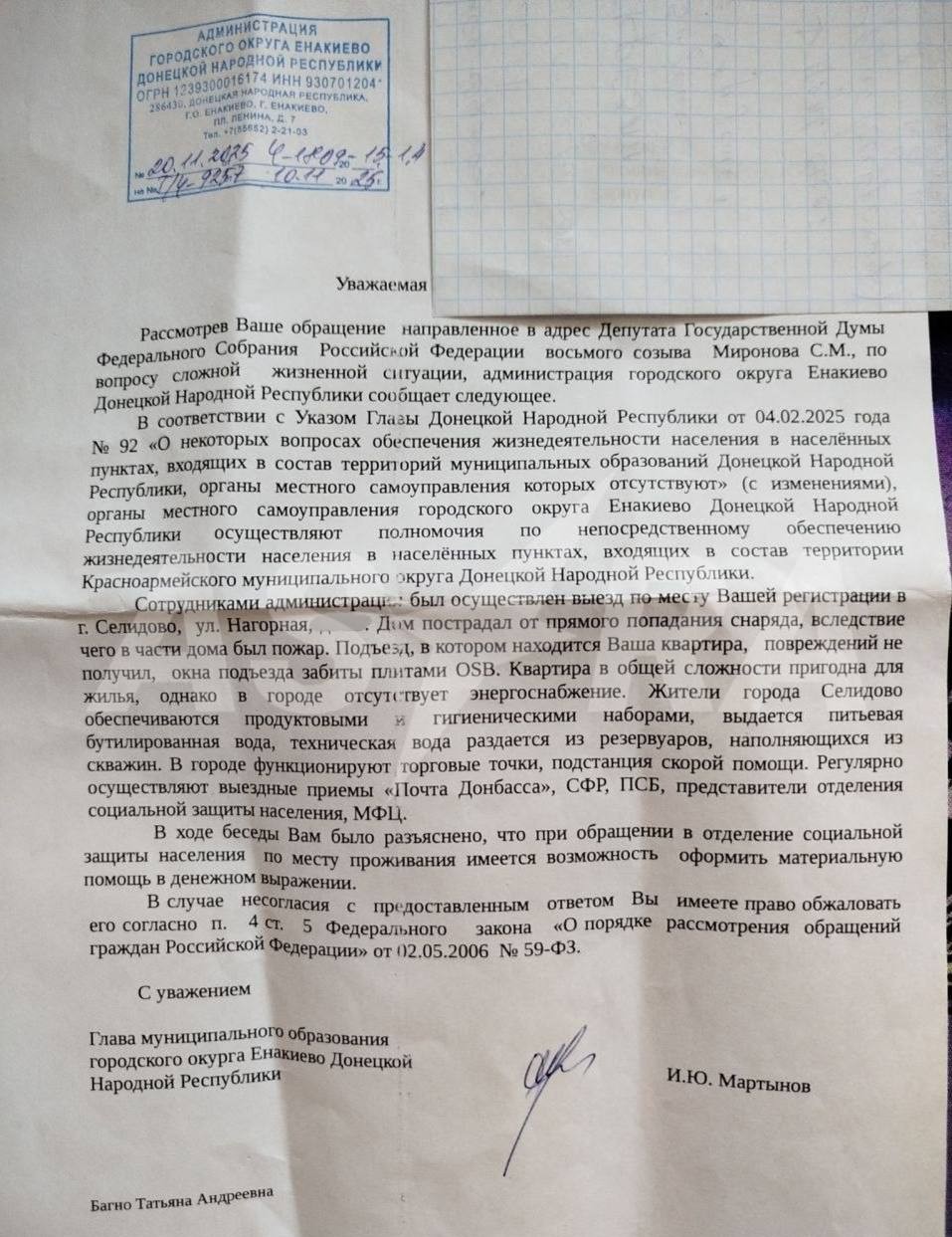 «Дом пострадал от прямого попадания снаряда, вследствие чего в части дома был пожар. Подъезд, в котором находится Ваша квартира, повреждений не получил, окна подъезда забиты плитами OSB. Квартира в общей сложности пригодна для жилья, однако в городе отсутствует энергоснабжение», — говорится в ответе на обращение женщины "администрации" городского округа Енакиево в "ДНР".