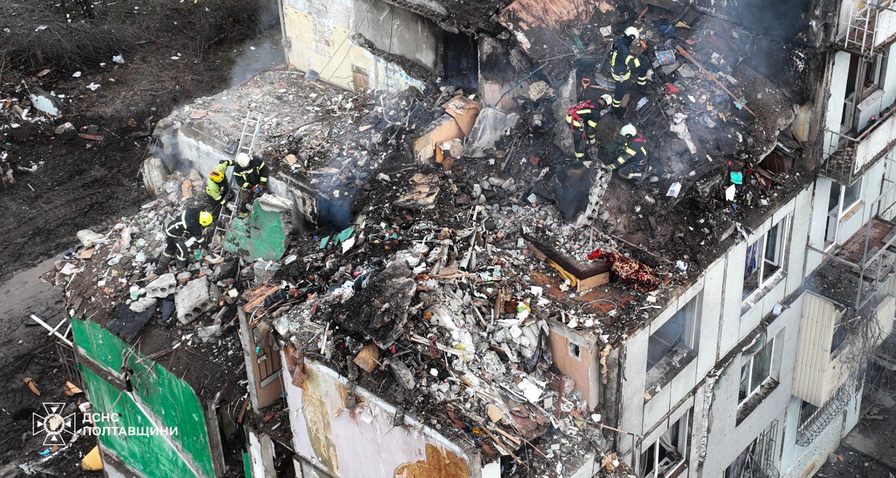 «В Полтаве завершены аварийно-спасательные работы на месте разрушенной пятиэтажки. В результате вражеского удара погибли 14 человек, из них 2 ребенка 9 и 12 лет», - сообщила ГСЧС Украины в Телеграм в 16:50 2 февраля.