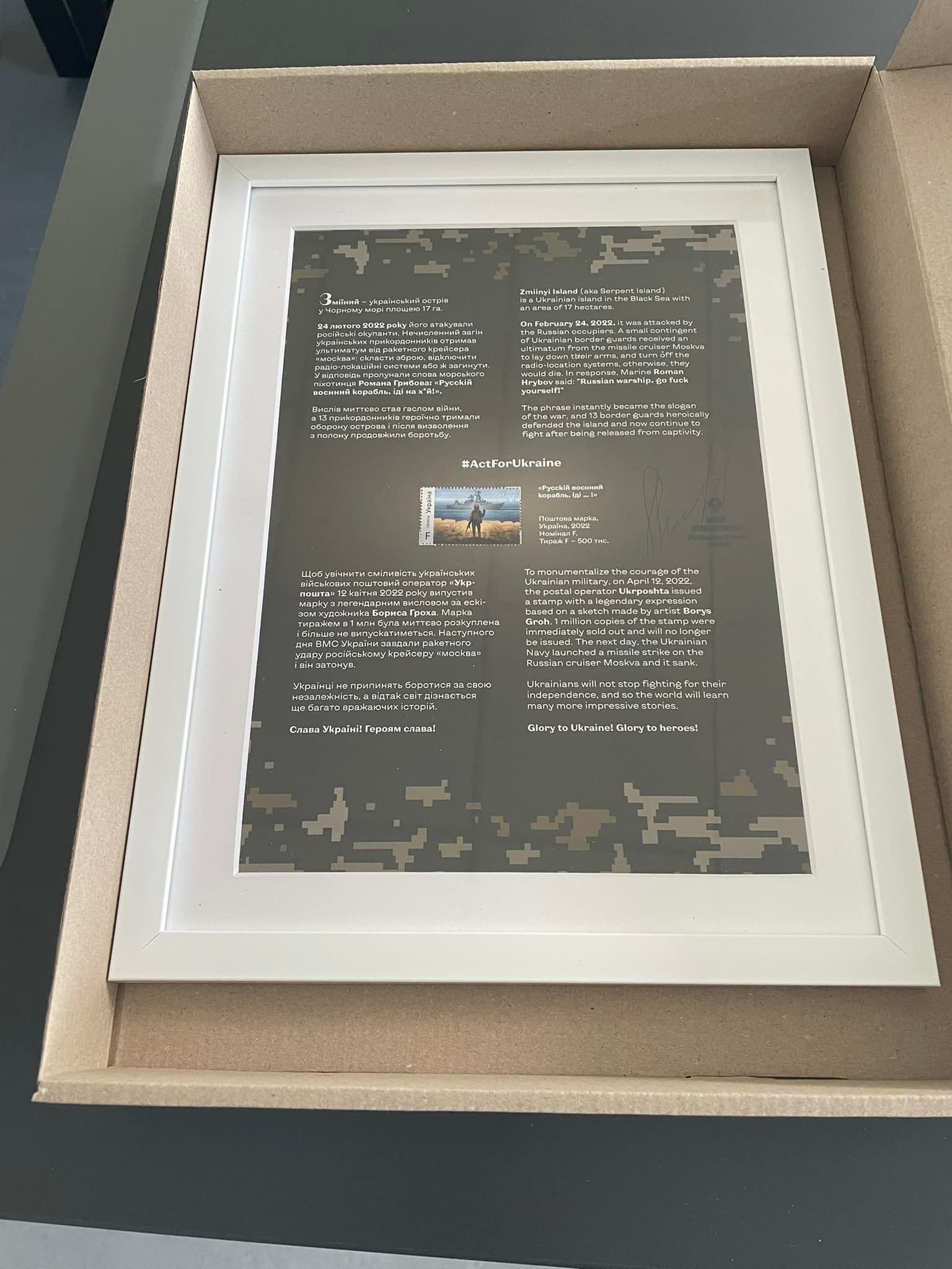 "Добрі люди передали мені легендарну марку “Русскій воєнний корабль іди …!” Це марка за підписом генерального директора Укрпошти Ігоря Смілянського. Серія в такому вигляді має лише 100 екземплярів. Дарується вона тим хто найбільше допомагає Україні перемогти росію. Така марка вже є у американських сенаторів, прем'єр-міністра Словаччини та спікера і буде в того хто переможе у цьому розіграші. Участь у розіграші візьмуть всі хто зробить внесок починаючи від 100 гривень", - написал М.Ткач.