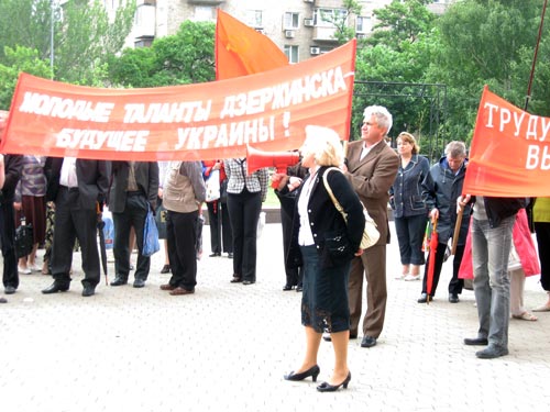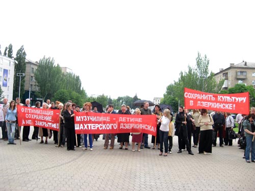 Около семидесяти жителей Дзержинска проводят возле здания Донецкого областного совета акцию протеста против закрытия музыкального училища в городе. Жители Дзержинска, среди которых много молодежи, держат в руках плакаты с надписями: «Сохраните культуру в Дзержинске», «Молодые таланты Дзержинска – это будущее Украины», «Музучилище – детище шахтерского Дзержинска», «Оптимизация - сохранение, а не закрытие», «Нет бескультурью и бездуховности». «Мы собрались, потому что вопрос один – на сессию Донецкого областного совета внесен вопрос о ликвидации Дзержинского музыкального училища. Уже второй год этот вопрос все время поднимается… На каком основании? Училище строили 45 лет назад - весь город», - заявила в комментарии «ОстроВ» житель города, помощник-консультант народного депутата от КПУ Николая Кравченко Людмила Петрига. По ее словам, одной из причин закрытия является то, что якобы у училища нет плана развития. «Но он был, мы подготовили план развития», -отметила она. По словам Петриги, вопрос о закрытии музучилища ставится уже второй год подряд и все это время «набора как такового не дают». В то же время она подчеркнула, что училище гордится своими выпускниками, которые «работают и в Вене, и в Германии, и во Франции, и в России, да и в Киеве».
