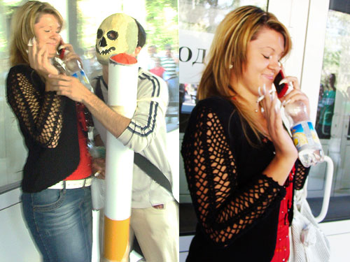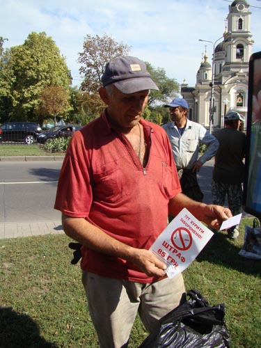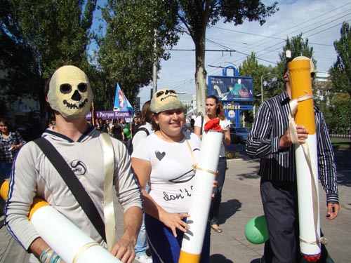 Непосвященным очевидцам антиникотиновой акции «Украина против табачного дыма» трудно было понять, что агрессивные "курильщики" на самом деле являются частью театрализованной программы, направленной на пропаганду здорового образа жизни и призывающей отказаться от курения.