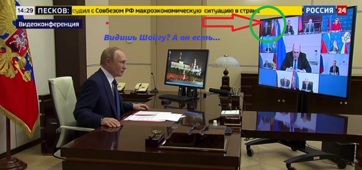 В подтверждении того, что Шойгу все-таки "доложил", был распространен крохотный видеоролик, на котором путин проводит какую-то видеоконференцию. Ролик был предложен российской аудитории без звука, зато - правильно подписанный: "Кадры заседания Путина с постоянными членами Совбеза. Докладывал Шойгу".