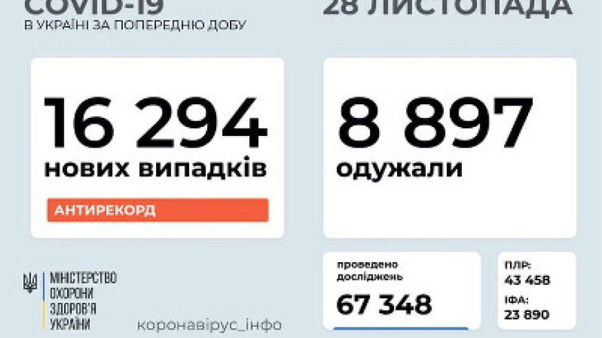В Украине по состоянию на 28 ноября зафиксировано 16 294 новых случаев коронавирусной болезни COVID-19. Об этом на своей Фейсбук-странице сообщил министр здравоохранения Максим Степанов. По его словам, в частности, за сутки заболели еще 689...