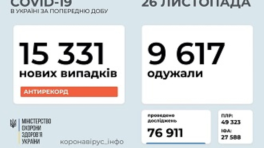 В Украине за прошлые сутки зафиксировано 15 331 новых случаев коронавирусной болезни COVID-19. Об этом сообщает министр здравоохранения Максим Степанов в Facebook. За прошлые сутки COVID-19 заболели 15 331 человек, из которых 659 детей и 606...