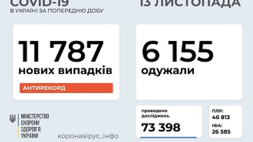 В Украине за прошлые сутки зафиксировано 11 787 новых случаев коронавирусной болезни COVID-19. Об этом сообщает министр здравоохранения Максим Степанов в Facebook. За прошлые сутки COVID-19 заболели 11 787 человек, из которых 388 детей и 555...