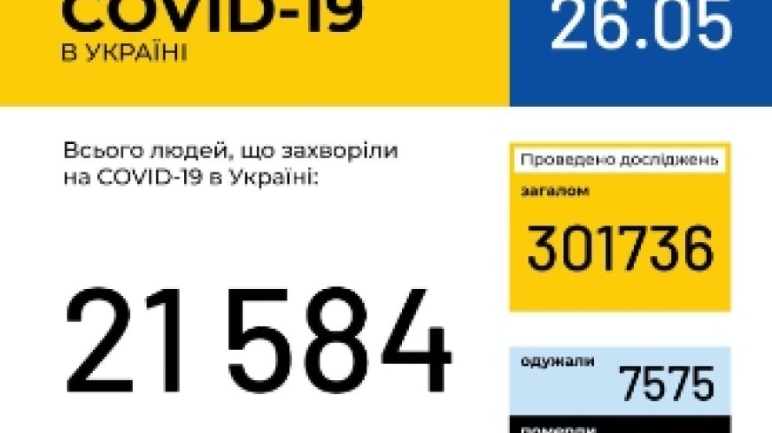 В Украине по состоянию на 26 мая зафиксированы 21 584 случаев коронавирусной болезни COVID-19. Об этом сообщил министр здравоохранения Максим Степанов сегодня на брифинге в Киеве, - передает корреспондент "ОстроВа". "За прошлые...