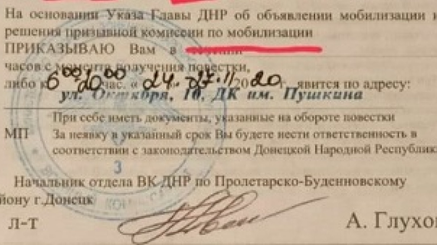 Оккупационные власти "ДНР" уверяют, что вручаемые жителям неподконтрольных территорий Донбасса повестки в военкомат поддельные и не соответствуют "указу" главаря "ДНР" Дениса Пушилина о сверке "резервистов"....