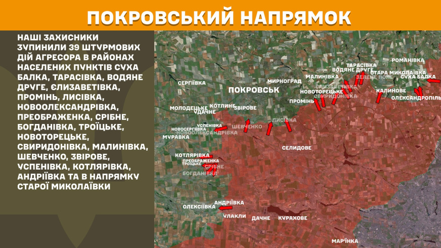 "На Покровском направлении российские войска 33 раза пытались продвинуться на позиции наших войск в районах населенных пунктов Шаховое, Родинское, Мирноград, Покровск, Котлино, Удачное, Молодецкое и в сторону Новопавловки. Наши защитники уже отбили...