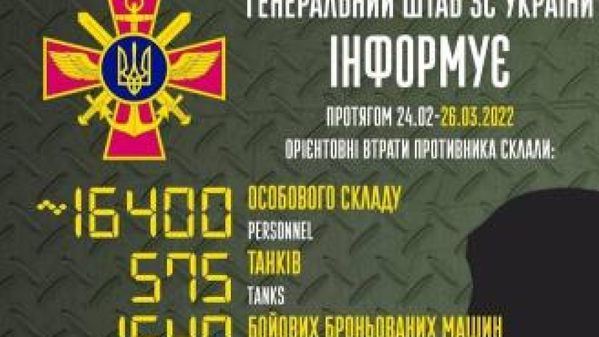 Общие боевые потери личного состава российских оккупантов с начала войны против Украины на 26 марта ориентировочно составили 16400 человек. Об этом говорится в сообщении Генерального штаба ВСУ. Общие боевые потери противника с 24 февраля по 26...